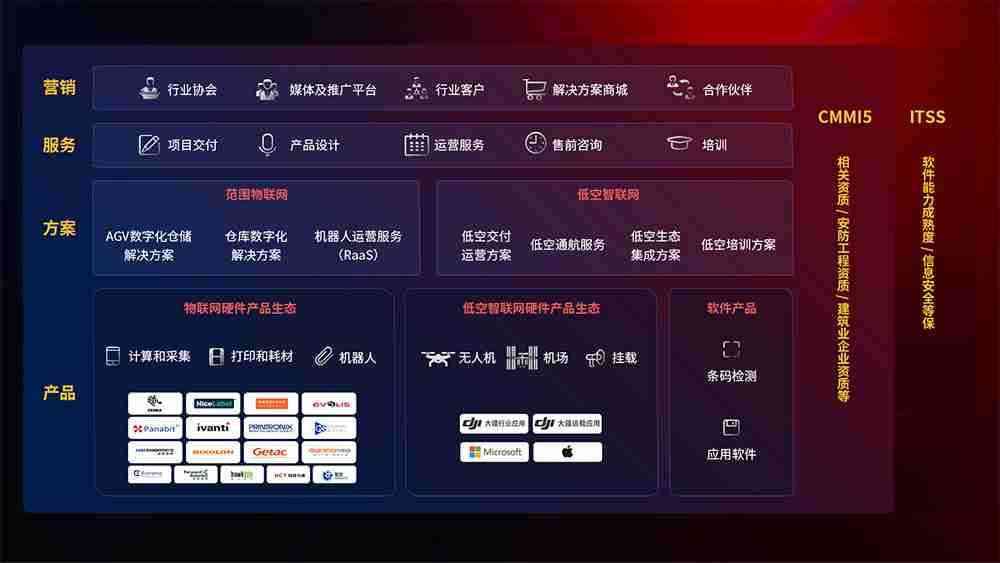聚合国内外先进的物联网硬件产品品牌,,,聚焦数字化仓储、、、、机器人运营、、、低空智联网等领域,,,共同打造适合客户业务场景的解决方案并提供交付服务